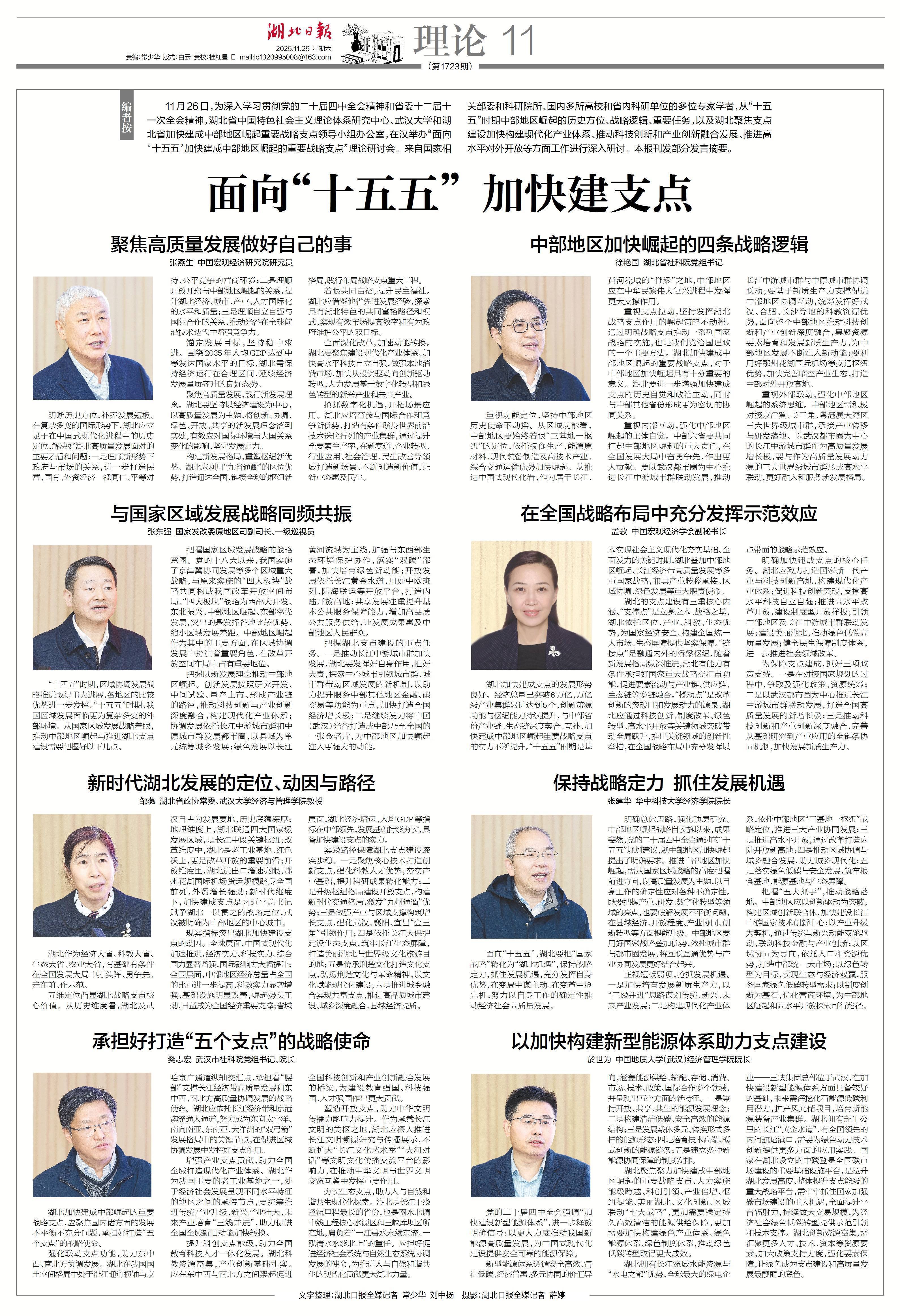 11月26日,为深入学习贯彻党的二十届四中全会精神和省委十二届十一次全会精神,湖北省中国特色社会主义理论体系研究中心、武汉大学和湖北省加快建成中部地区崛起重要战略支点领导小组办公室,在汉举办“面向‘十五五’加快建成中部地区崛起的重要战略支点”理论研讨会。来自国家相关部委和科研院所、国内多所高校和省内科研单位的多位专家学者,从“十五五”时期中部地区崛起的历史方位、战略逻辑、重要任务,以及湖北聚焦支点建设加快构建现代化产业体系、推动科技创新和产业创新融合发展、推进高水平对外开放等方面工作进行深入研讨。本报刊发部分发言摘要。