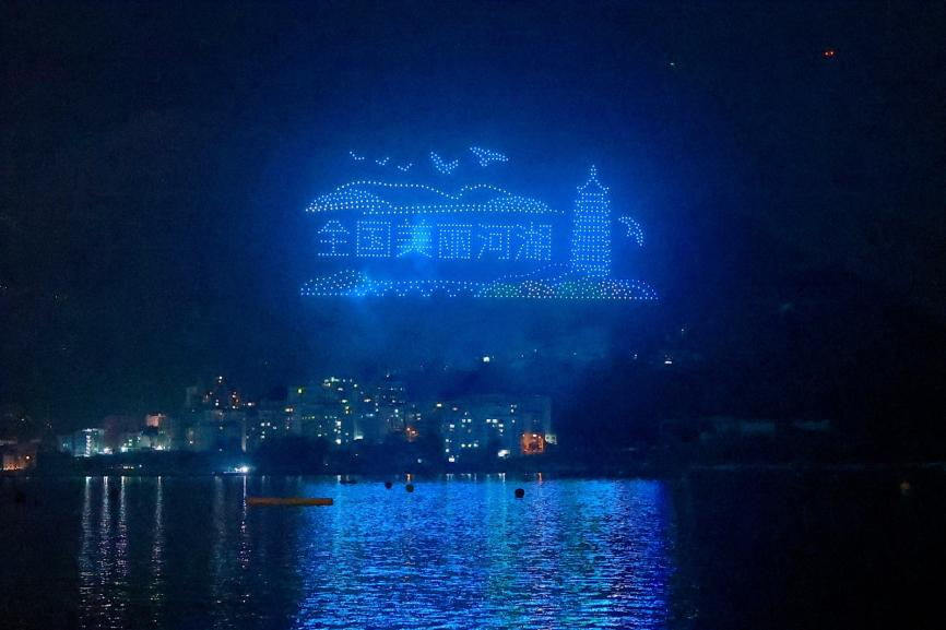 千架无人机灯光秀点亮汉丰湖夜空。