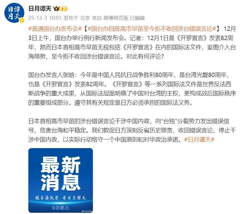 12月3日上午,国台办举行例行新闻发布会。记者:12月1日是《开罗宣言》发表82周年,然而日本首相高市早苗无视包括《开罗宣言》在内的国际法文件,妄图介入台海局势,至今拒不收回涉台错误言论。对此有何评论?