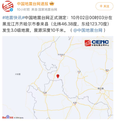 中国地震台网正式测定:10月02日00时03分,在黑龙江齐齐哈尔市泰来县(北纬46.38度,东经123.70度)发生3.0级地震,震源深度10千米。