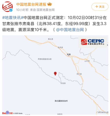 中国地震台网正式测定:10月02日00时31分,在甘肃张掖市肃南县(北纬38.41度,东经99.99度)发生3.3级地震,震源深度10千米。