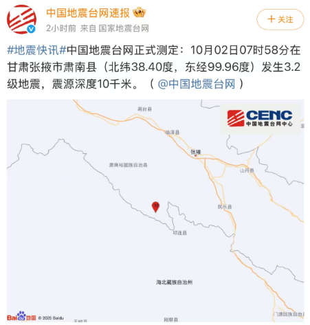 中国地震台网正式测定:10月02日07时58分,在甘肃张掖市肃南县(北纬38.40度,东经99.96度)发生3.2级地震,震源深度10千米。