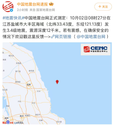 中国地震台网正式测定:10月02日08时27分,在江苏盐城市大丰区海域(北纬33.43度,东经121.13度)发生3.4级地震,震源深度12千米。